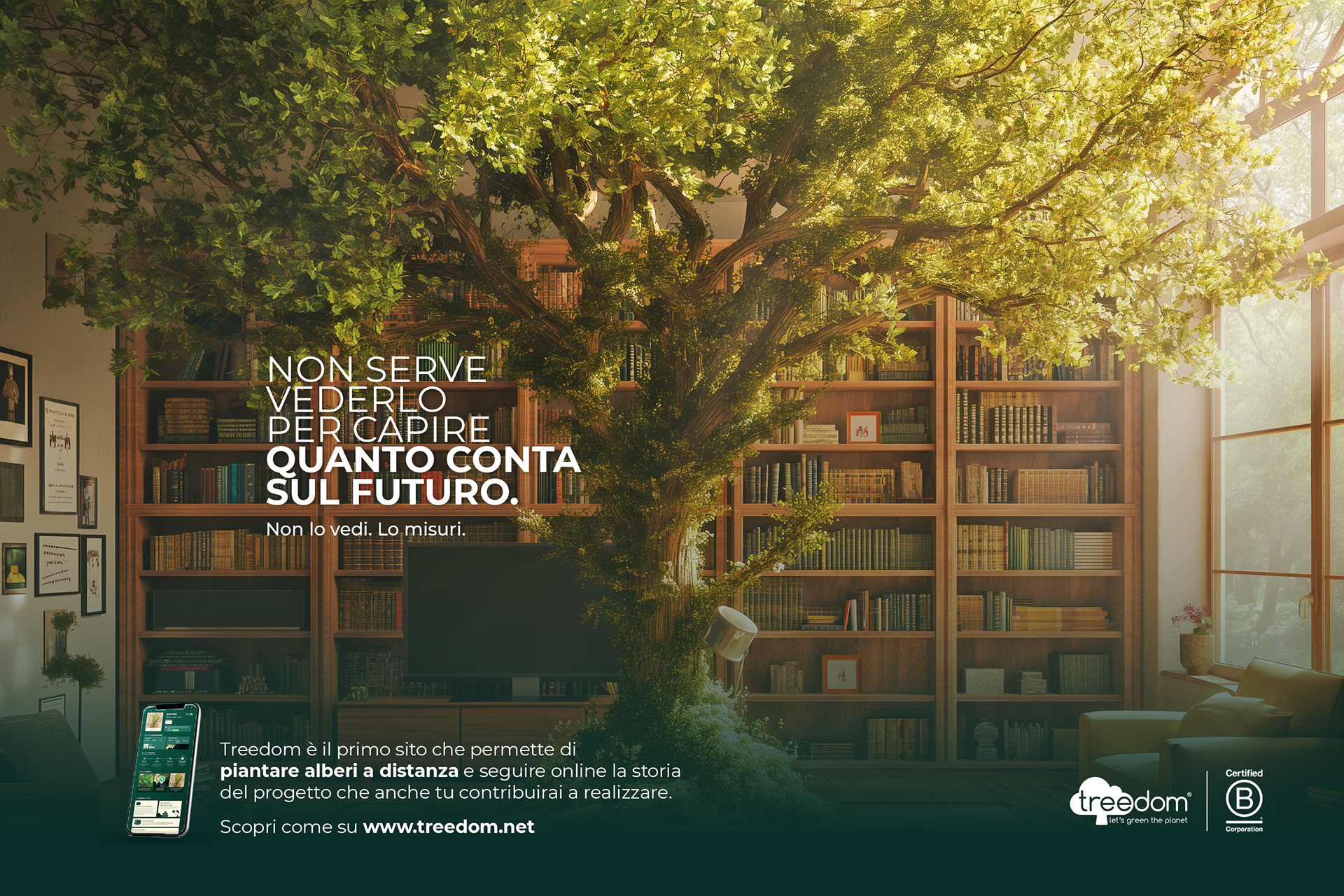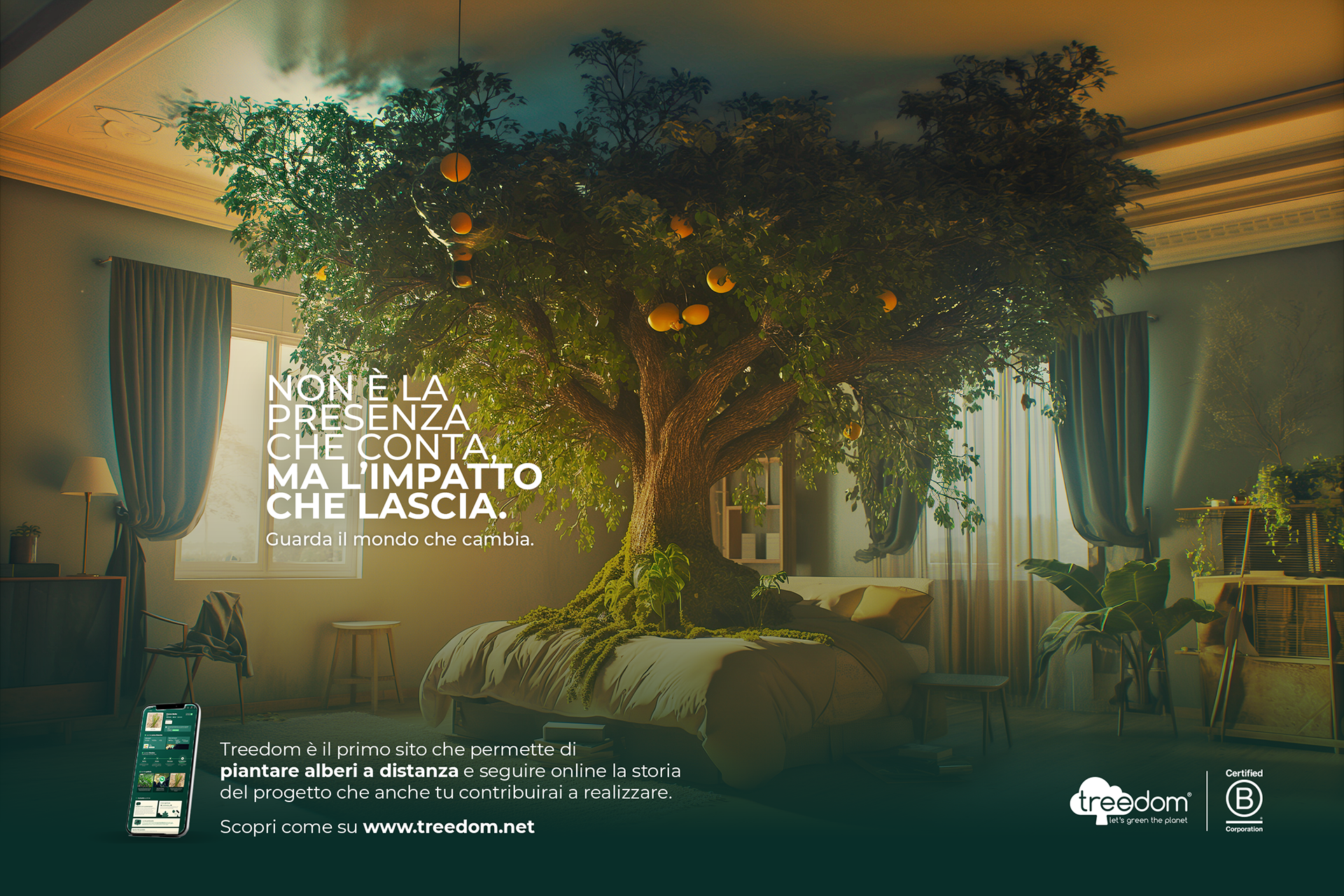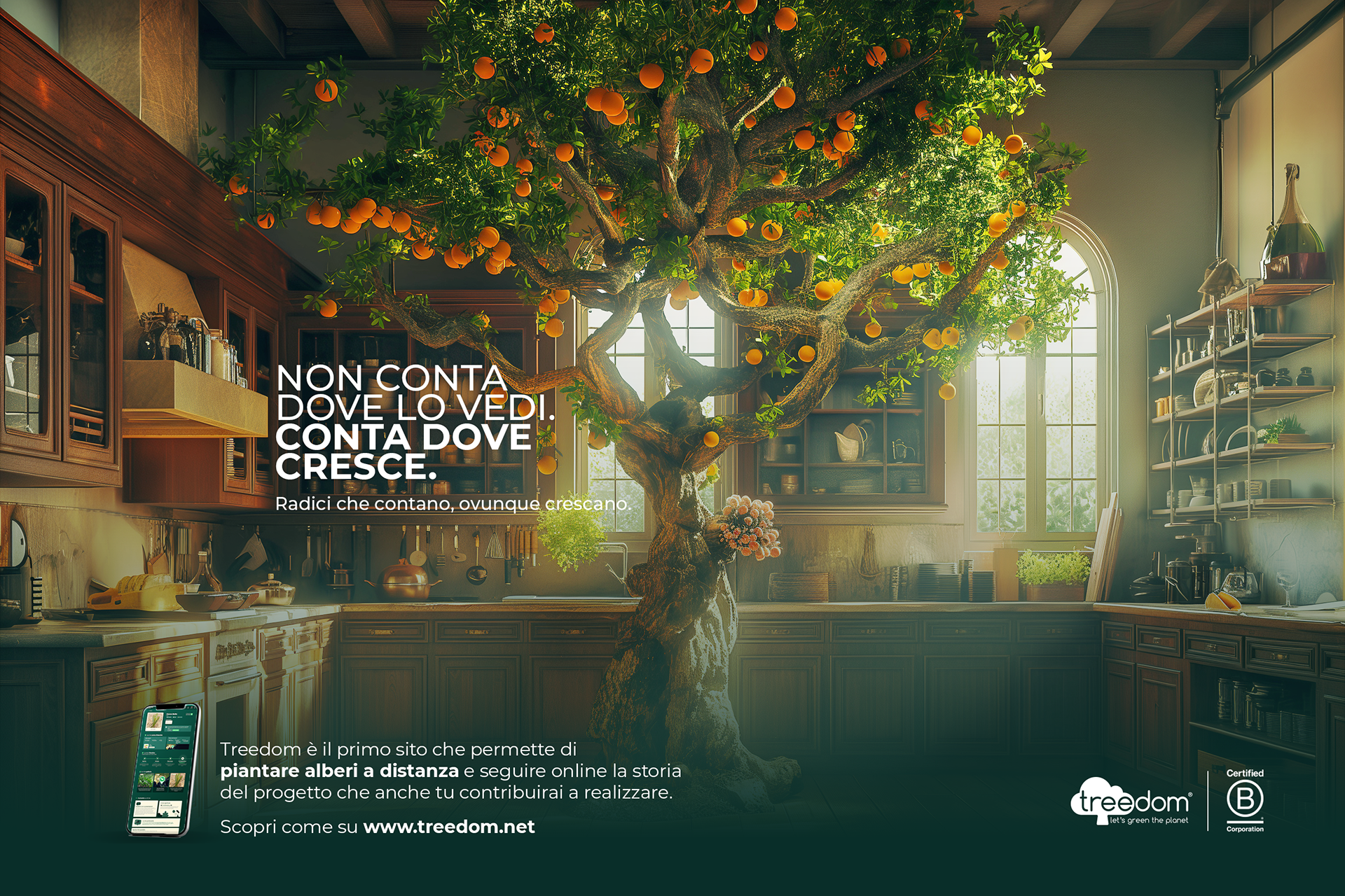 This multi-subject campaign plays with irony by imagining giant trees growing inside different rooms of the house from the living room to the kitchen, to highlight in a witty yet impactful way that the tree you buy on Treedom is real, even if you can’t physically see it at home.